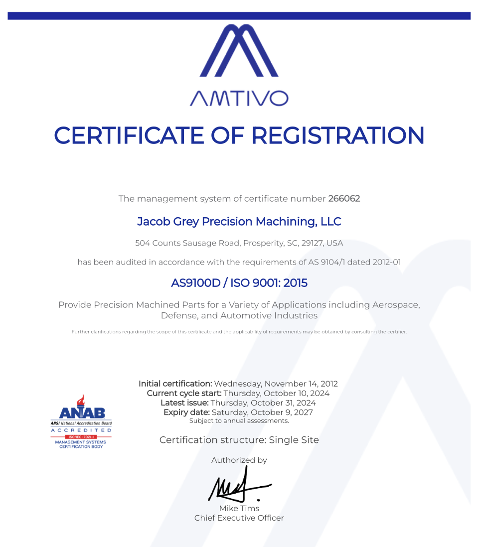 For over 13 years, Jacob Grey Precision Machining has proudly operated as an AS9100-certified facility. This aerospace-grade certification means every process, every procedure, and every part we produce meets the most rigorous global standards — ensuring uncompromising quality, consistency, and performance in every component we manufacture.